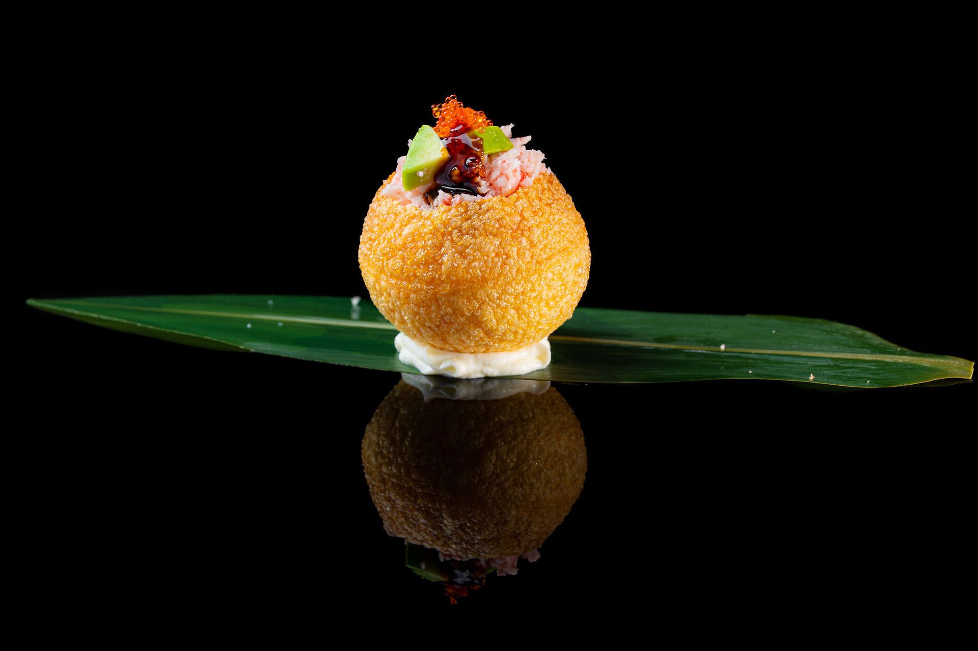 Sfere croccante indiane, granchio di surimi, avocado, tobiko e salsa teriyakide